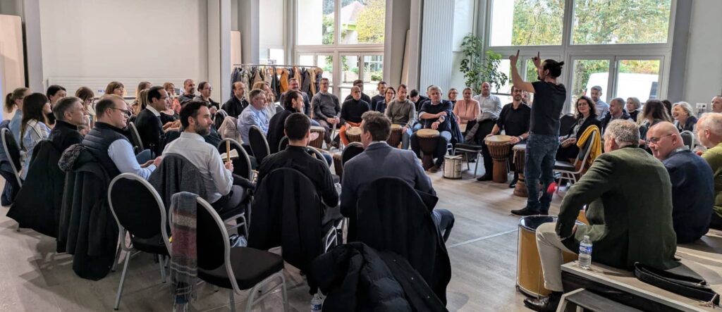 Animés par David, notre facilitateur basé en région nantaise, nos ateliers de teambuilding percussion ont un faible impact environnemental. Authentiques et sans artifice, ils plongent les participants dans un univers où le rythme est un vecteur de cohésion et de confiance. Accessible à tous, sans distinction de parcours ou de compétences musicales, nos sessions sont une invitation à l’écoute mutuelle et à la connexion, qui renforcent la puissance du collectif